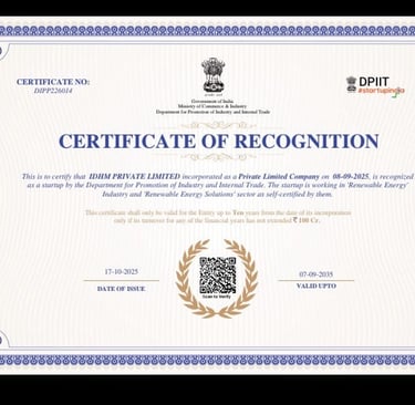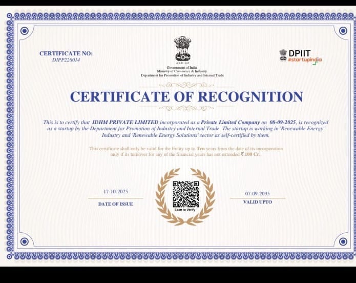 We are absolutely thrilled to announce a landmark achievement for IDHM: the official recognition as a certified Startup by the Department for Promotion of Industry and Internal Trade (DPIIT), Government of India! This recognition is more than just a certificate; it is a profound validation of our vision, technology, and commitment to India’s sustainable energy future. It officially identifies IDHM as a pioneer in innovation that is working towards scalable solutions to national problems. Acknowledging the Circular Economy Pioneer IDHM's core mission is to transform agricultural waste into valuable, clean energy—specifically, Bio-CNG—and organic fertilizer. This aligns perfectly with the Government of India’s push for energy security, the GOBAR-Dhan scheme, and the larger goal of achieving net-zero emissions. The DPIIT recognition strengthens our position as a leader in the circular economy, acknowledging our technology’s potential to: Enhance Energy Security: By producing reliable, indigenous Bio-CNG as a clean transport fuel alternative. Empower Farmers: By creating a decentralized supply chain that converts waste into wealth for the agricultural sector. Boost ESG Impact: By providing an environmentally sound solution for waste management, reducing emissions, and creating high-quality organic manure. What This Means for Our Partners and Stakeholders For our current and future partners, investors, and stakeholders, the DPIIT recognition signifies: Trust and Credibility: It serves as a strong endorsement from the Government of India, enhancing our credibility in both domestic and international markets. Access to Benefits: It unlocks several benefits offered under the Startup India initiative, including simplified regulatory compliance, faster patent filing, and potential tax benefits, which allow us to focus more resources on R&D and scaling operations. Commitment to Innovation: It reaffirms that IDHM is built on a foundation of proprietary innovation and a disruptive business model designed for long-term sustainability and growth. Looking Ahead As we scale our 20 TPD Bio-CNG plant projects, this DPIIT recognition fuels our drive to accelerate the adoption of sustainable energy solutions across the country. We are grateful for the support of the government, our team, and our partners who believe in our mission. The journey to a greener India powered by Bio-CNG is just beginning, and we are excited to lead the charge.